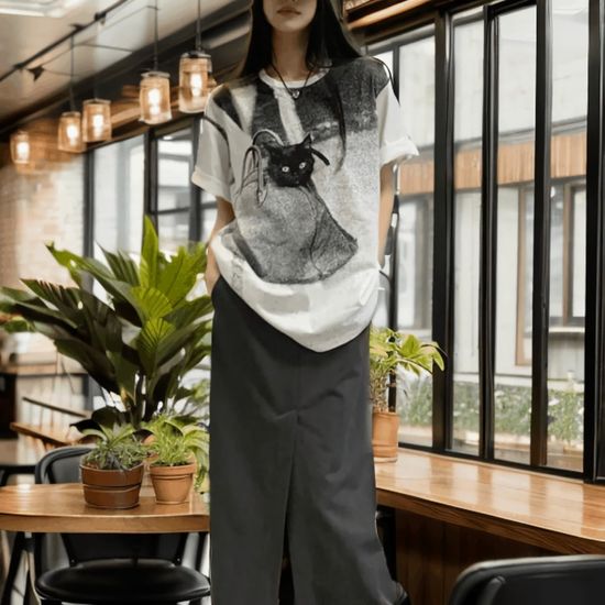 여성 고양이 캣츠 무드 프린팅 루즈핏 반팔티셔츠