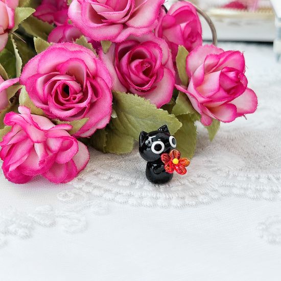 유리 미니어쳐 꽃을 든 고양이 블랙